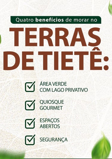 No Terras de Tietê, você terá acesso a um ambiente planejado para o seu bem-estar, com lago, quadras esportivas, pista de caminhada e espaço fitness.